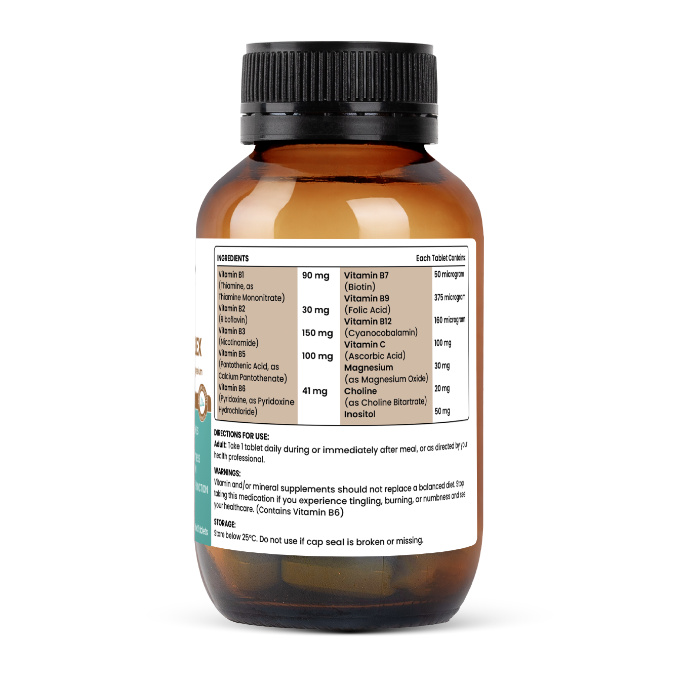 Vitamin C 100 mg, Vitamin B7 50 mcg, Vitamin B5 100 mg, Vitamin B12 160 mcg, Vitamin B9 375 mcg, Vitamin B3 150 mg, Magnesium 30 mg, Vitamin B6) 41 mg, Vitamin B1 90 mg, Vitamin B2 30 mg, Choline 20 mg, Inositol 50 mg
